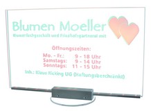 | NML-Solutions design and produce illuminated Plexiglass signs for advertising and information purposes. The illumination is caused by a combination of a special adhesive film attached to a diamond polished plexiglass sheet that is illuminated by a set of coloured LEDīs. The LEDīs are housed in an aluminium rail attached to the base.